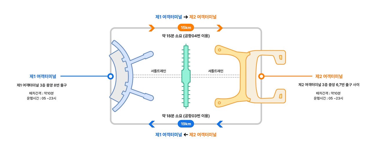 - 탑승 장소: 제1 여객터미널 3층 중앙 8번출구 / 제2 여객터미널 3층 중앙 6,7번 출구 사이