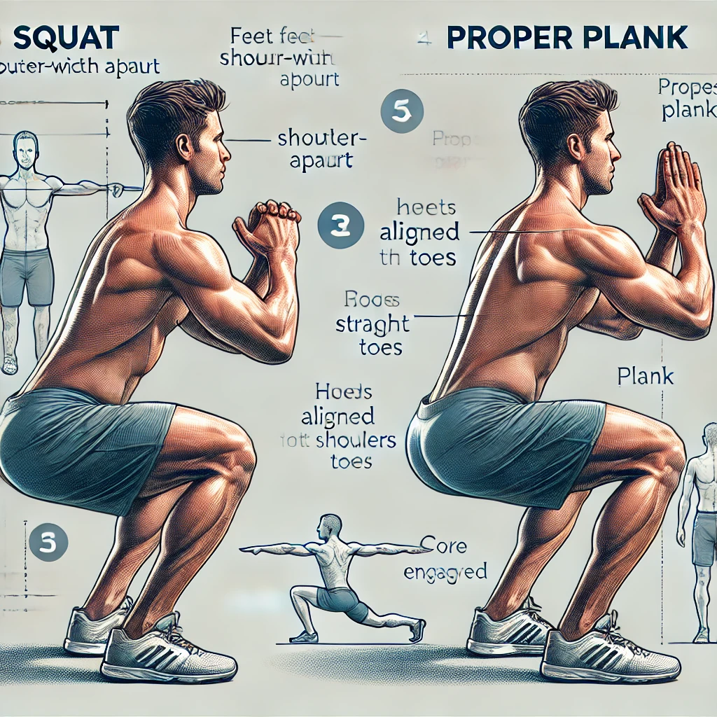 - 스쿼트: 하체와 코어 근육 강화에 효과적입니다.