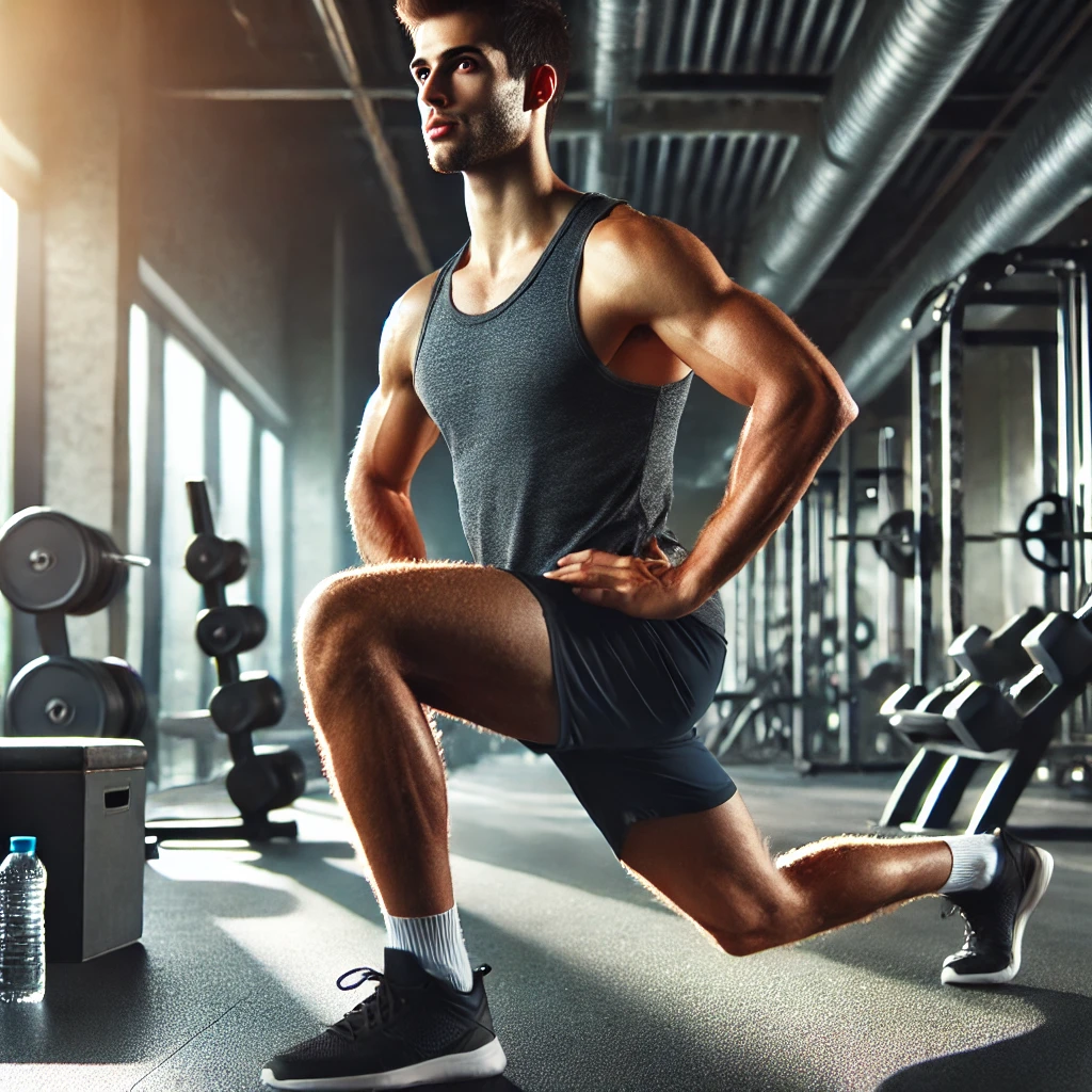 - 한 발을 앞으로 내디디며 무릎을 직각으로 구부린다.