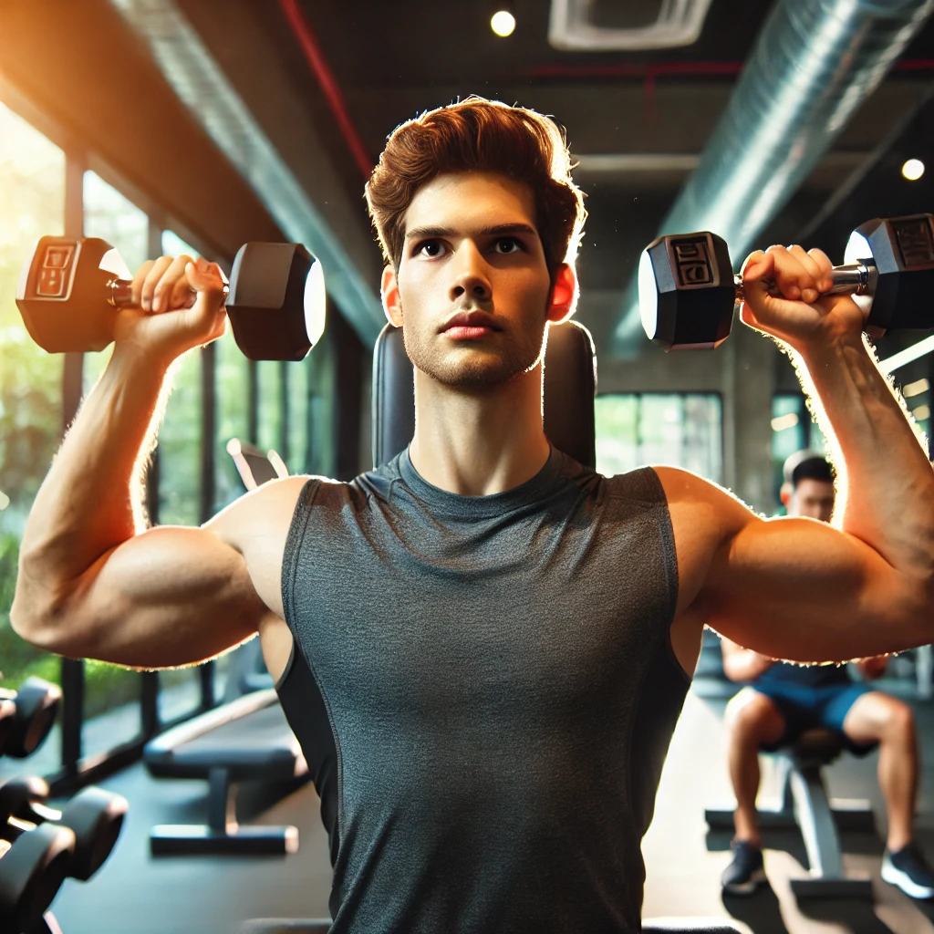 - 팔을 쭉 펴서 머리 위로 덤벨을 밀어 올린다.
